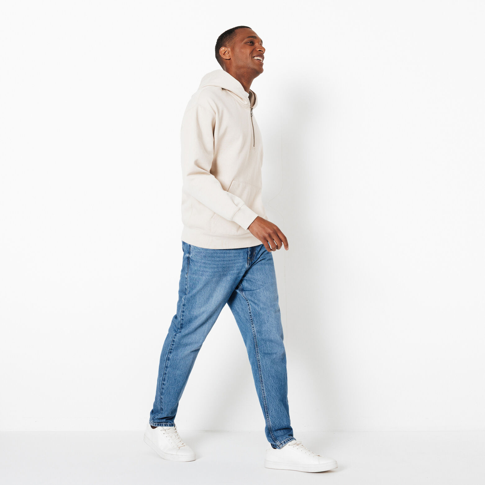 Ce jean tapered, disponible en 4 longueurs, s'adapte à tous les styles. Sa coupe moderne et ses surpiqûres contrastées lui donnent un look tendance et facile à porter au quotidien.