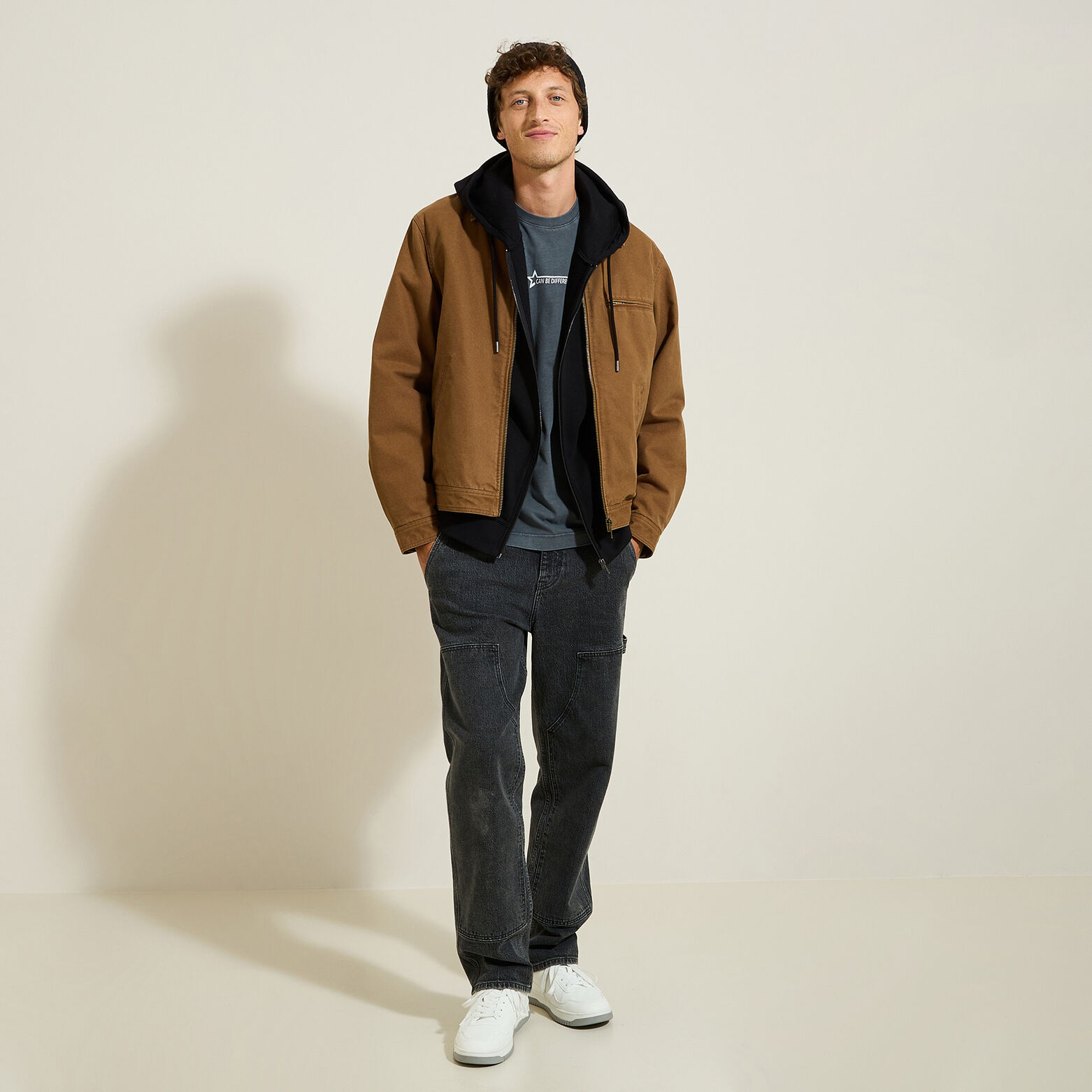 Ce t-shirt s'associe parfaitement avec un pantalon cargo beige et des baskets blanches pour un look décontracté et tendance.
