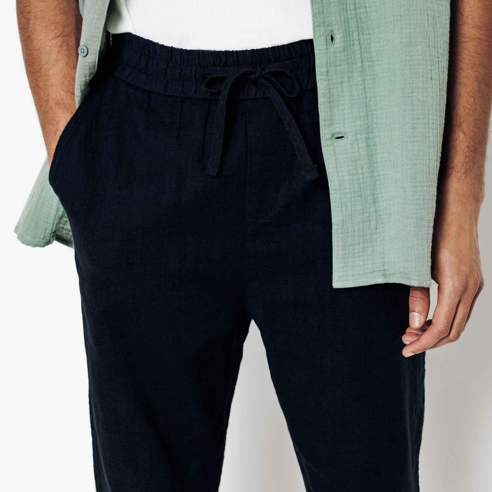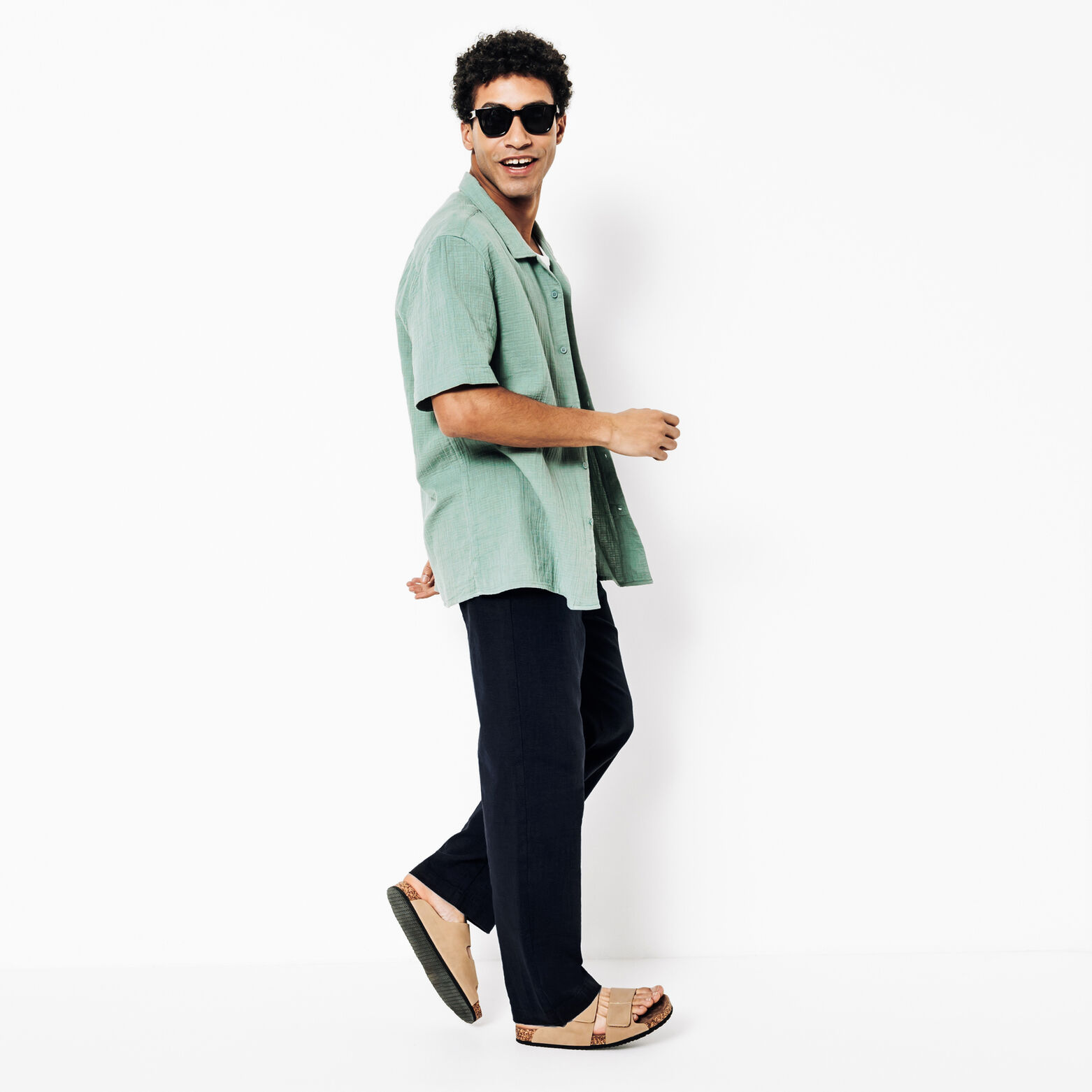 Ce pantalon se marie parfaitement avec un t-shirt blanc basique et une chemise à manches courtes ouverte pour un look décontracté et estival. Des sandales complètent la tenue en toute simplicité.