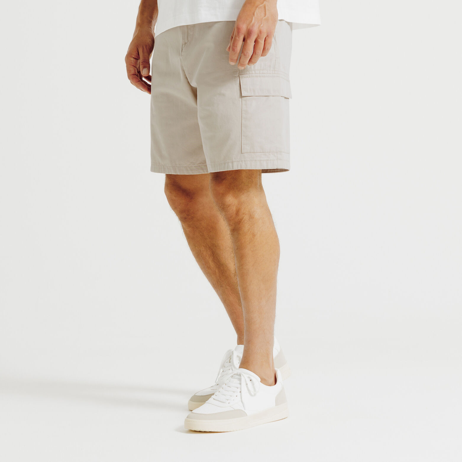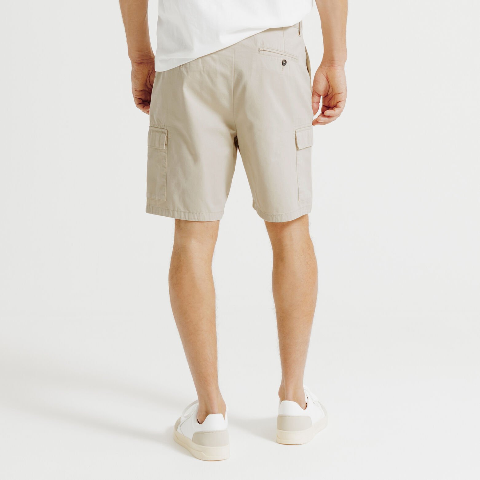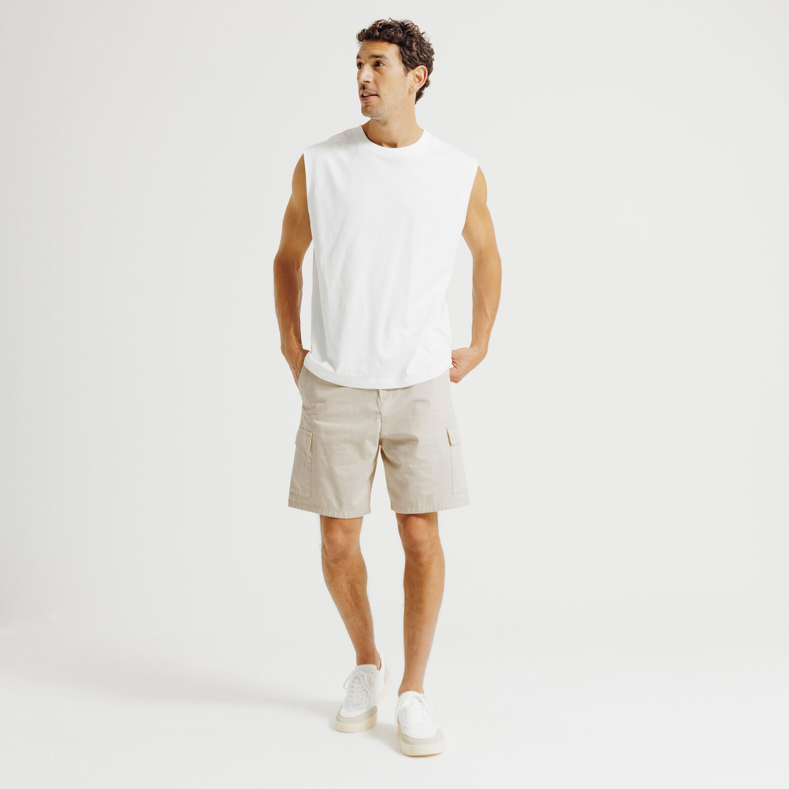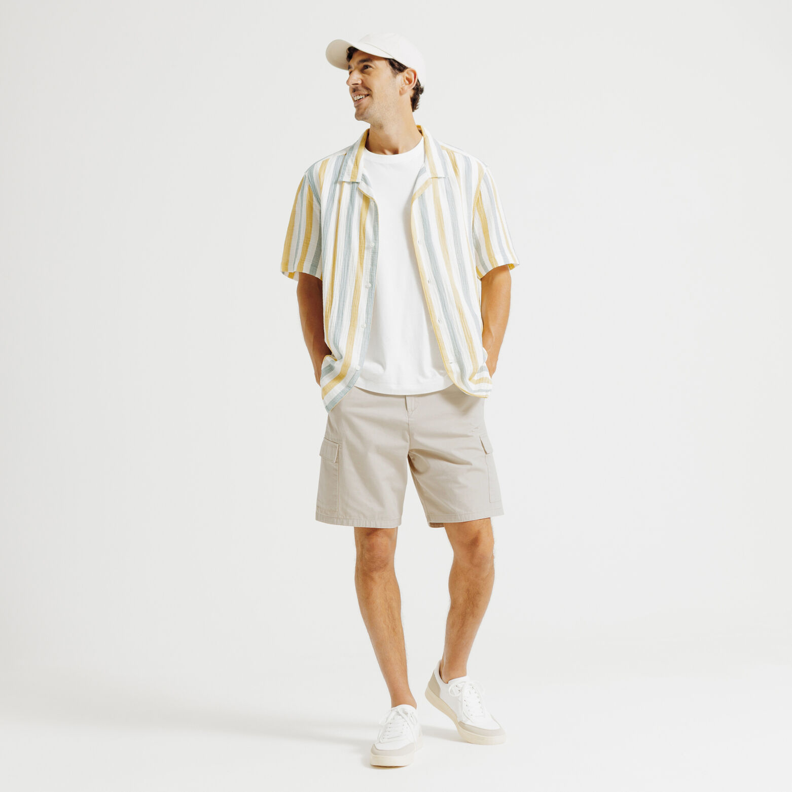 Ce short cargo se marie parfaitement avec un t-shirt basique et des baskets pour un look décontracté. On peut aussi l'associer à une chemise légère et des chaussures bateau pour un style plus habillé.