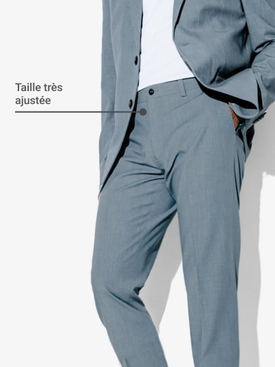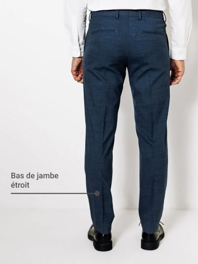 Pour une allure soignée, votre pantalon de costume doit avoir une coupe droite et un seul pli. En marchant, le bas du pantalon doit effleurer la chaussure sans laisser apparaître vos chaussettes. Notez cependant qu’un ourlet plus court, type "feu de plancher", est actuellement une tendance mode.