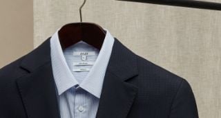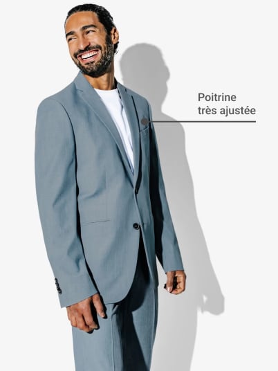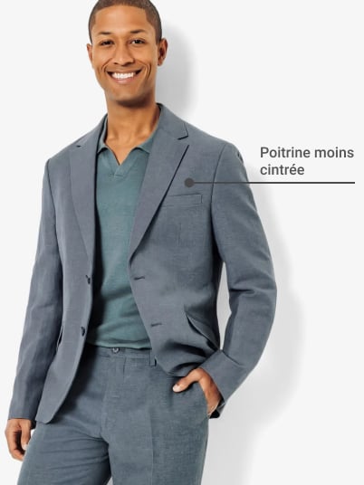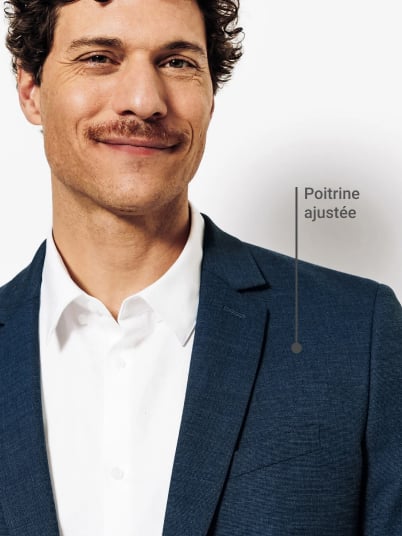 Pour porter votre veste à la perfection, trouvez le point le plus ajusté juste au-dessus de vos hanches. Attention, une coupe trop cintrée peut venir créer des plis et un effet de "volume" non désiré. De profil, votre veste se doit d’épouser la ligne naturelle de votre dos en étant cintrée sans être trop serrée. Une fois boutonnée, elle doit rester lisse, sans être sous tension.
