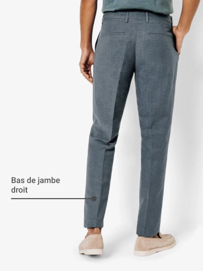 Le choix de la largeur du bas de jambe définit la coupe du pantalon (slim à 17 cm). La différence avec la cuisse permet de distinguer un modèle fuselé pour une silhouette élancée, d'une coupe regular pour un look décontracté. Le confort et la durabilité doivent guider votre choix, en évitant les coupes trop serrées. La longueur optimale du pantalon va se situer juste au-dessus de la chaussure.