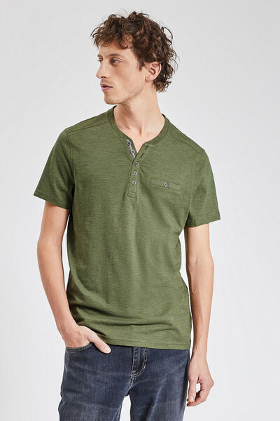 Le t-shirt à col tunisien homme vous confère un look à la fois chic et décontracté. Avec son col fermé par une patte de boutonnage, votre tee-shirt homme col tunisien constitue une parfaite alternative au t-shirt classique à col rond avec une touche originale et chic. Le col tunisien adopte la matière du t-shirt et emprunte l’encolure boutonnée du polo en laissant le col. À manches courtes ou à manches longues, le tee-shirt col tunisien arbore une allure de baroudeur assumée. Dans notre collection en ligne, nous mettons à votre disposition divers modèles disponibles qui se déclinent en plusieurs couleurs : beige, jaune, kaki, bleu, blanc, vert, noir…