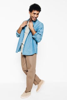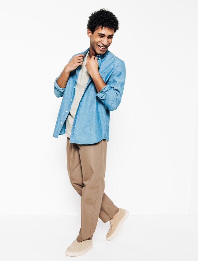 Un message à faire passer ? N’hésitez plus, choisissez un tee-shirt imprimé avec du texte. À porter sous une chemise homme en jean par exemple ou une veste, il accentue votre côté jeune et dynamique. Terminez votre tenue avec une paire de sneakers blanches, indémodables.
