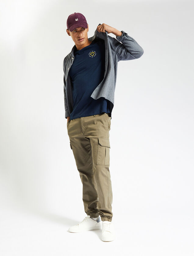 Un message à faire passer ? N’hésitez plus, choisissez un tee-shirt imprimé avec du texte. À porter sous une chemise homme en jean par exemple ou une veste, il accentue votre côté jeune et dynamique. Terminez votre tenue avec une paire de sneakers blanches, indémodables.