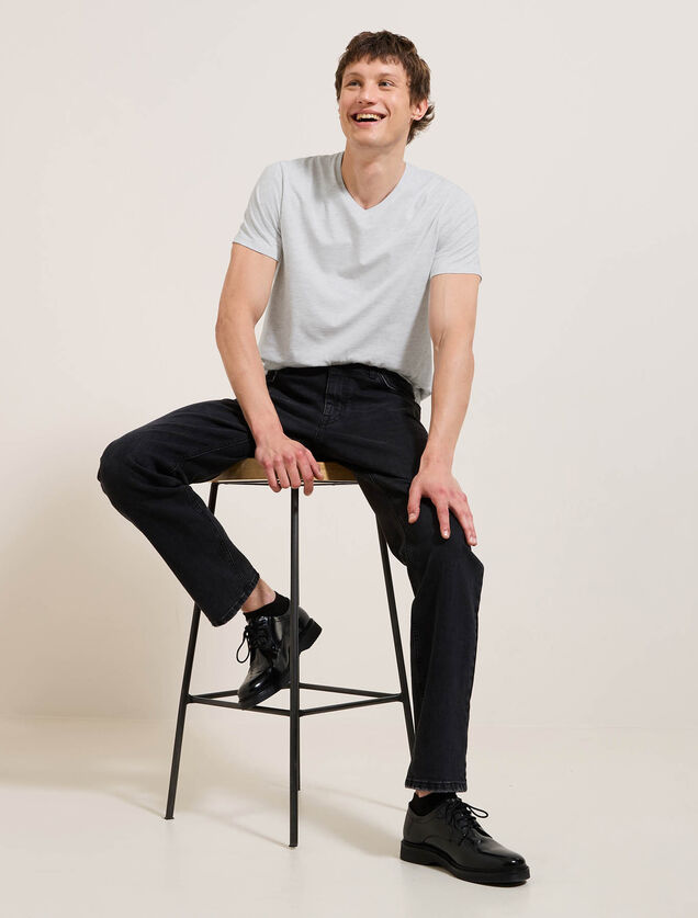Un message à faire passer ? N’hésitez plus, choisissez un tee-shirt imprimé avec du texte. À porter sous une chemise homme en jean par exemple ou une veste, il accentue votre côté jeune et dynamique. Terminez votre tenue avec une paire de sneakers blanches, indémodables.