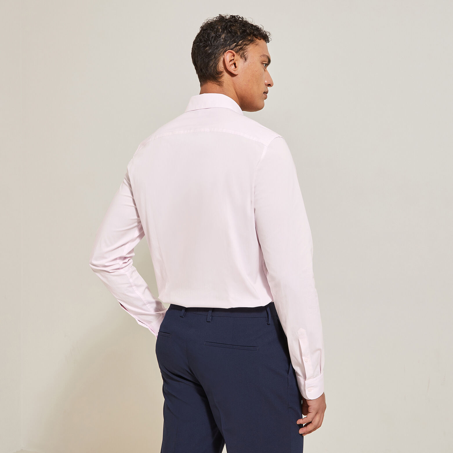 Cette chemise, unie à manches longues, s'associe aisément avec un chino ou un pantalon de costume.