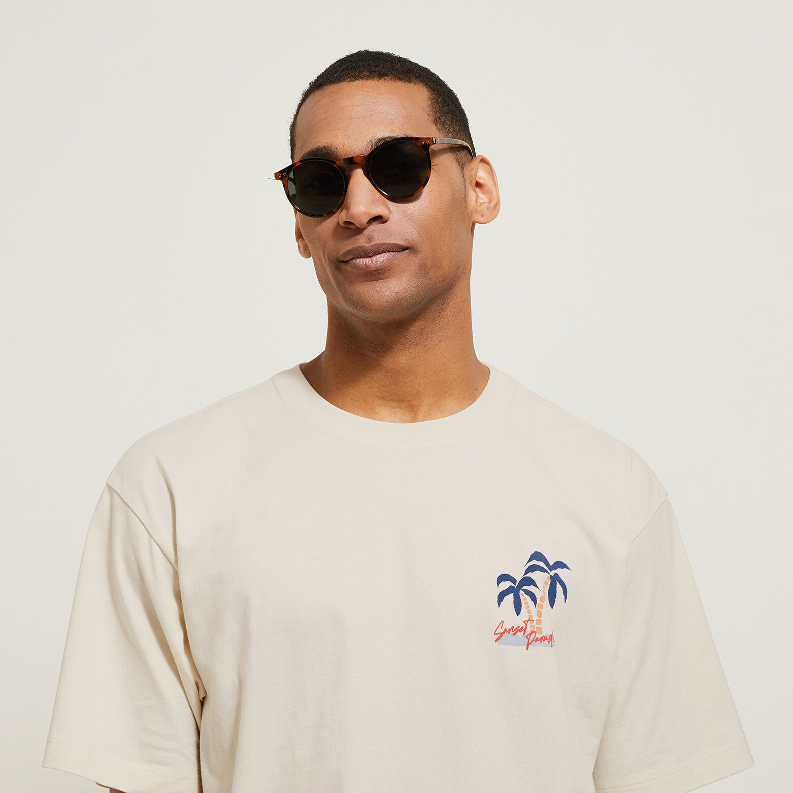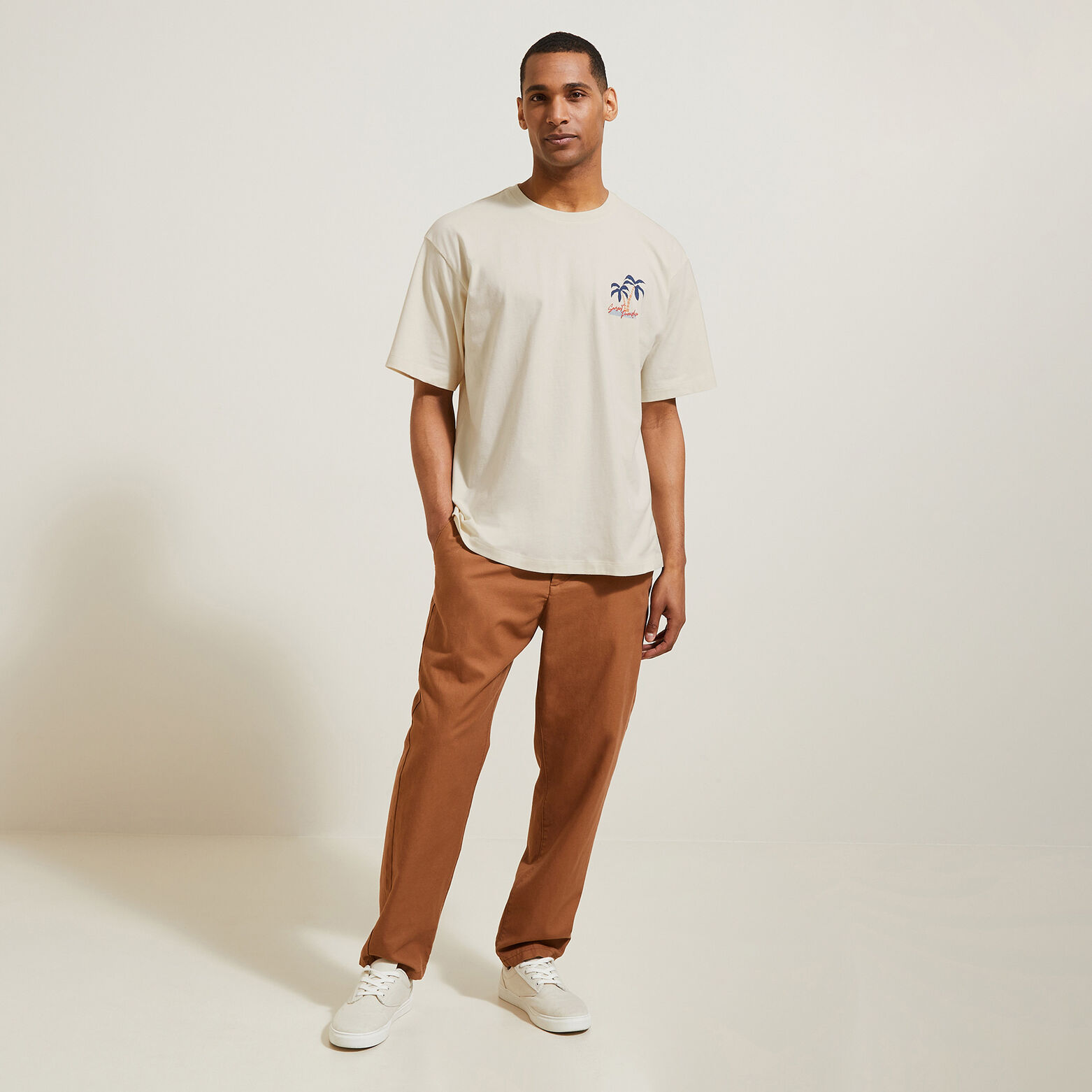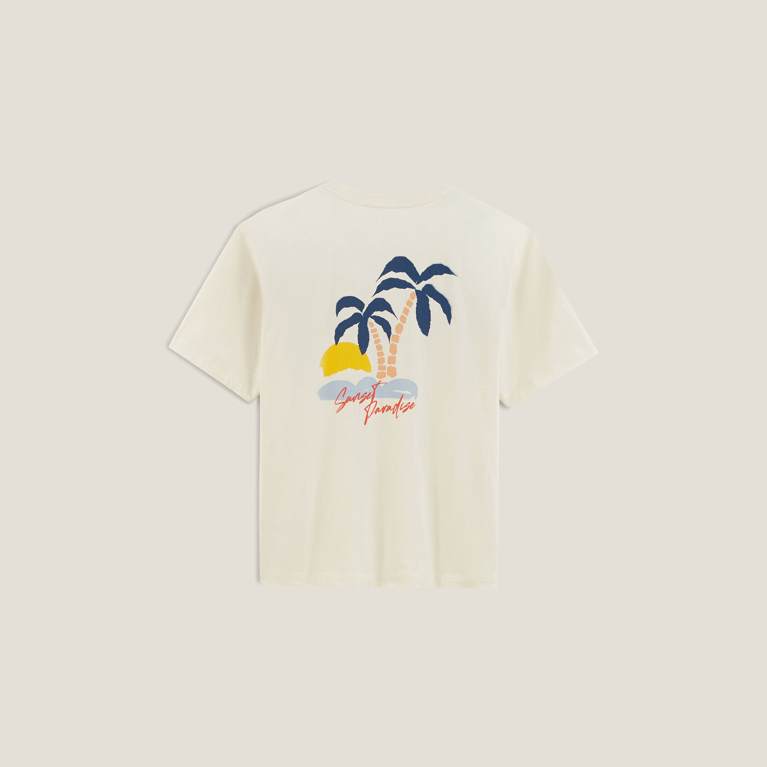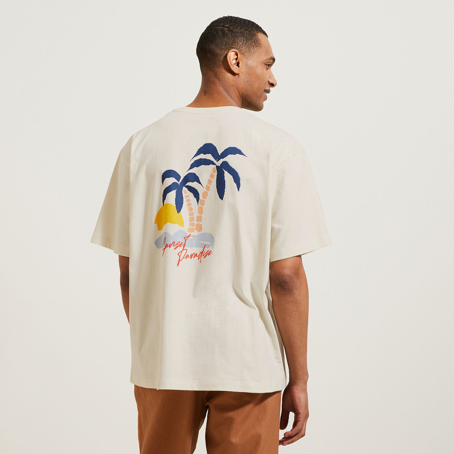 Ce t-shirt à manches courtes, imprimé palmiers devant et dos, peut s'associer à un jean ou un chino pour une allure casual.