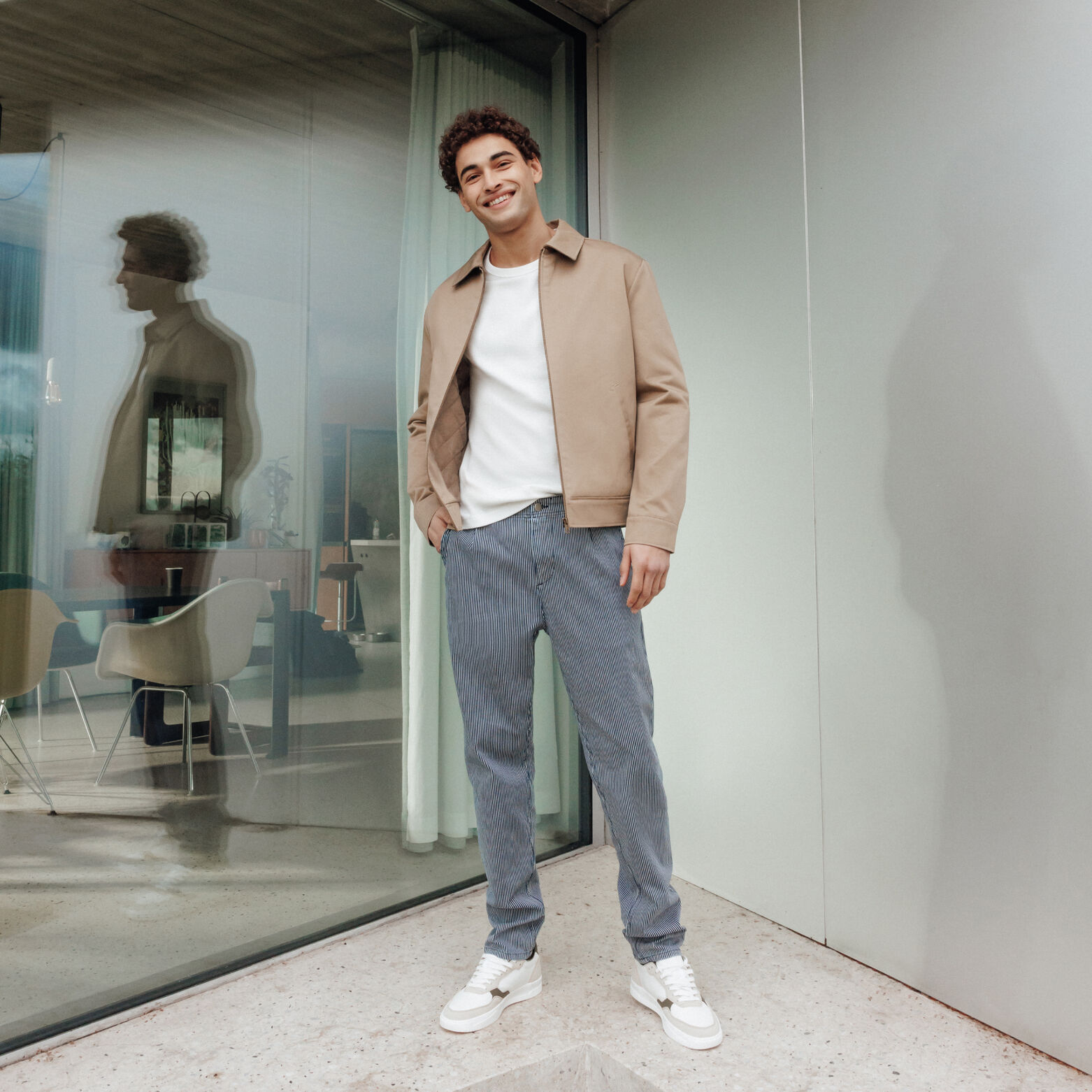 Ce pantalon à rayures verticales se marie parfaitement avec un sweat blanc à col rond pour un look décontracté et tendance. Vous pouvez compléter votre tenue avec des chaussures marrons pour un style élégant et confortable.
