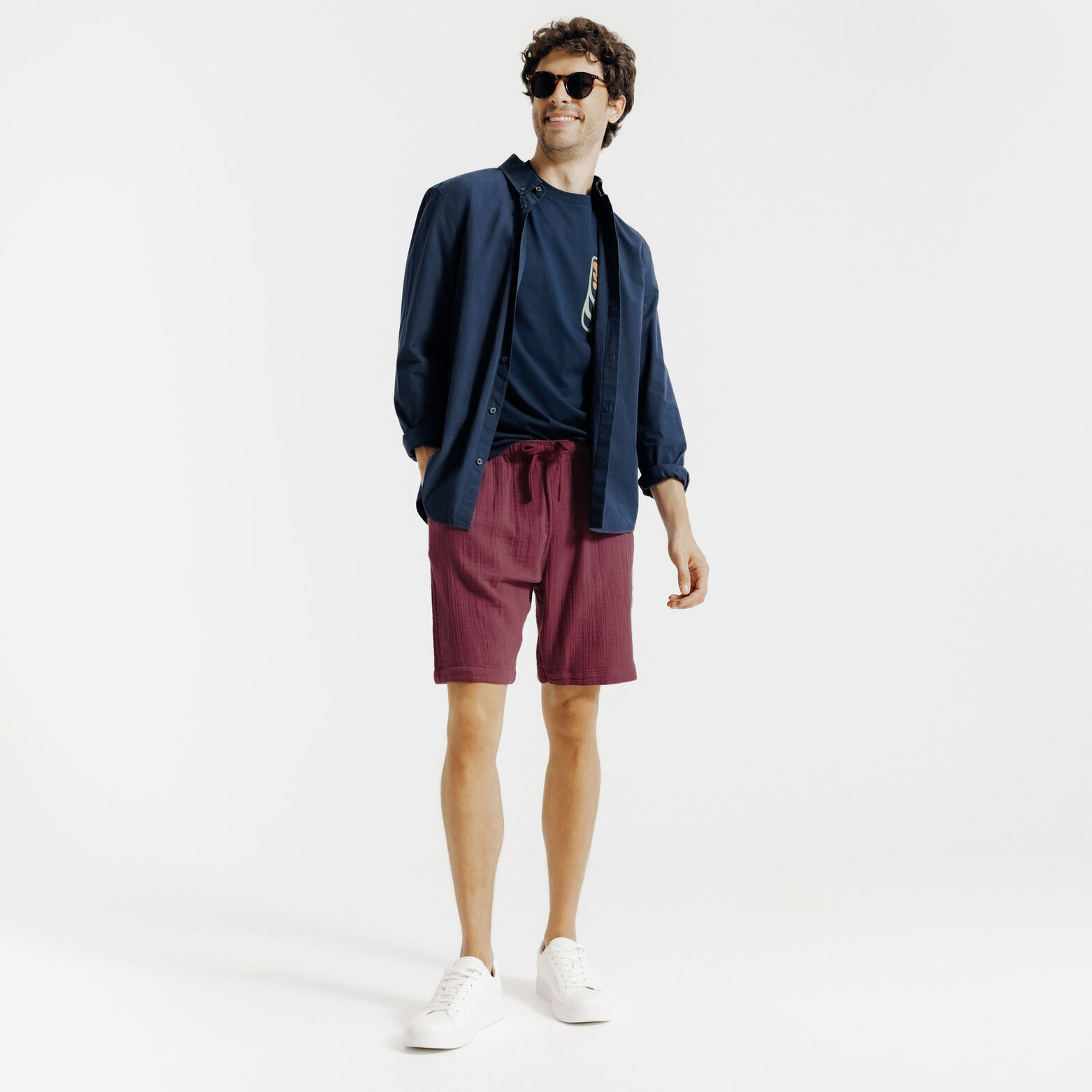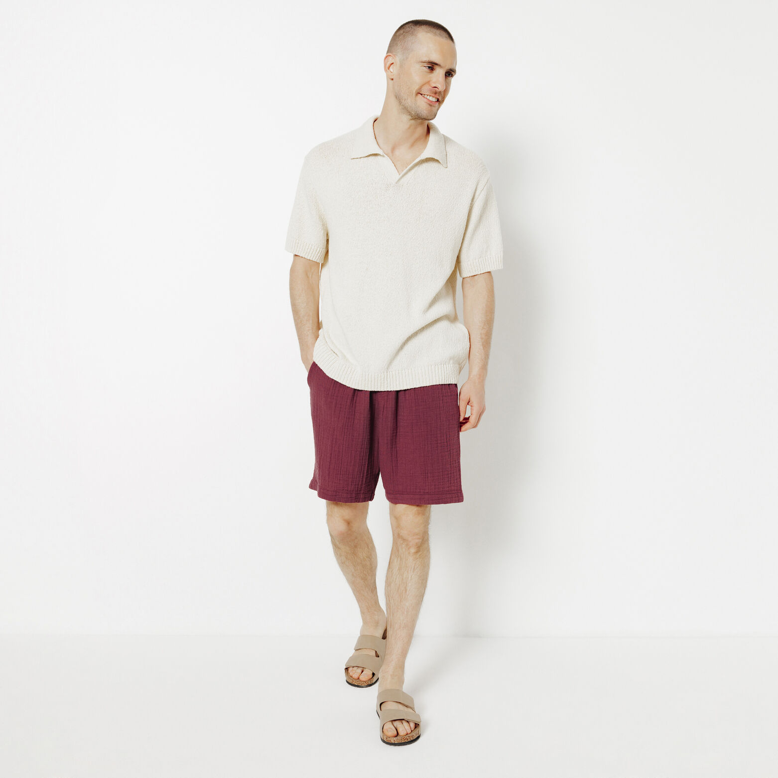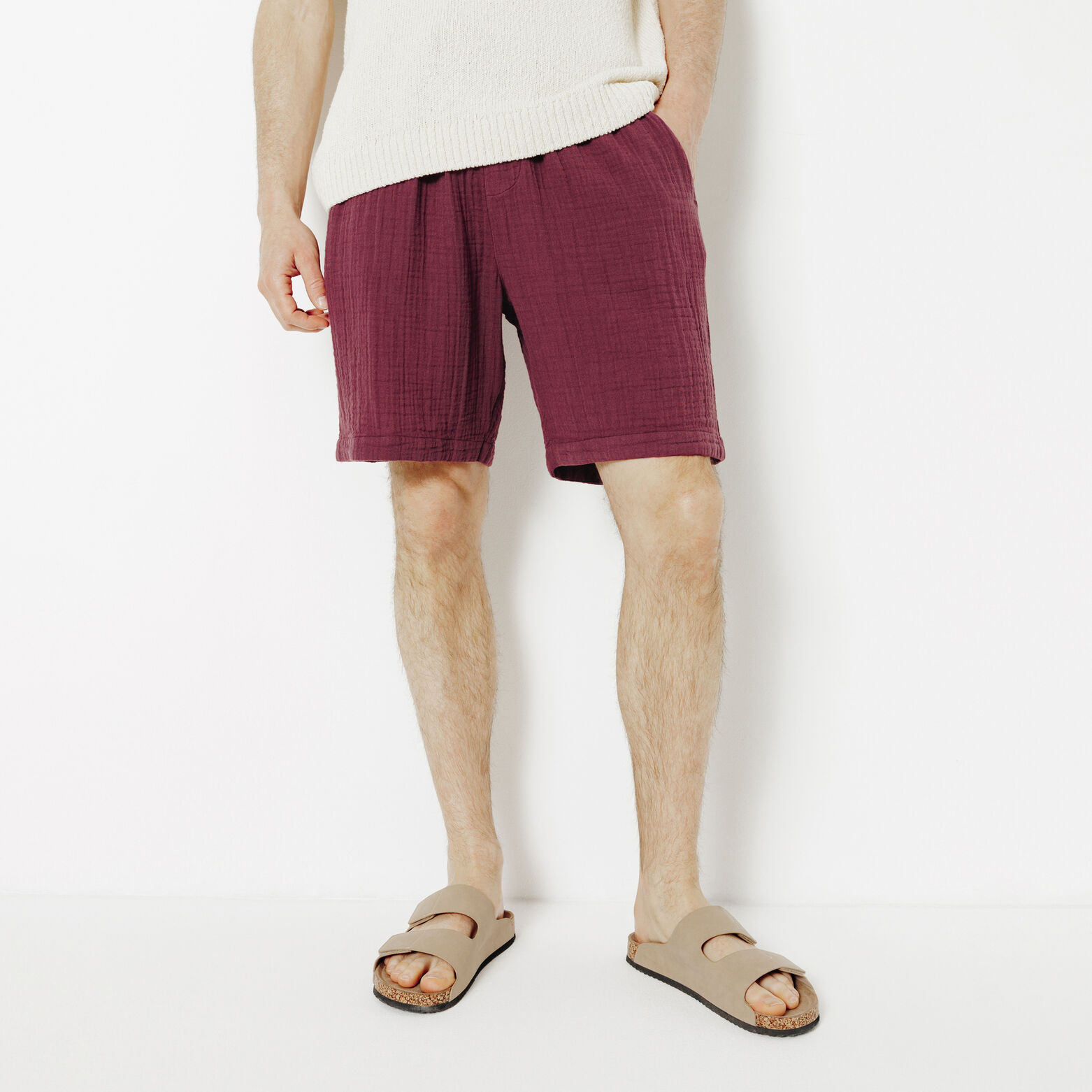 Ce bermuda en gaze de coton allie style et décontraction grâce à sa texture unique et sa taille élastique avec cordon de serrage.