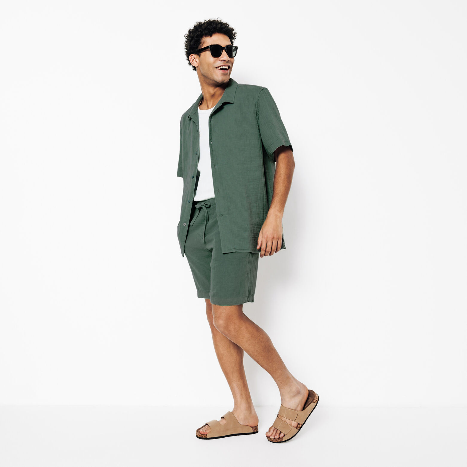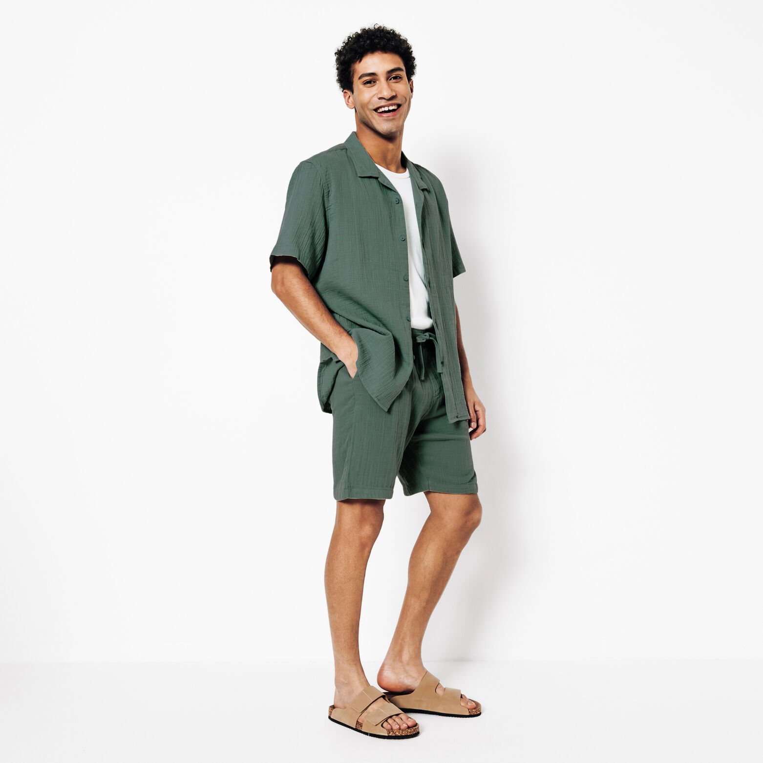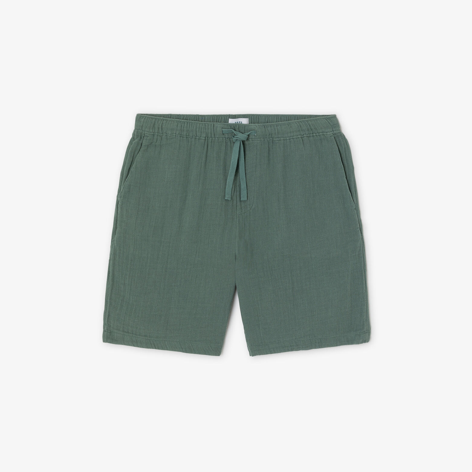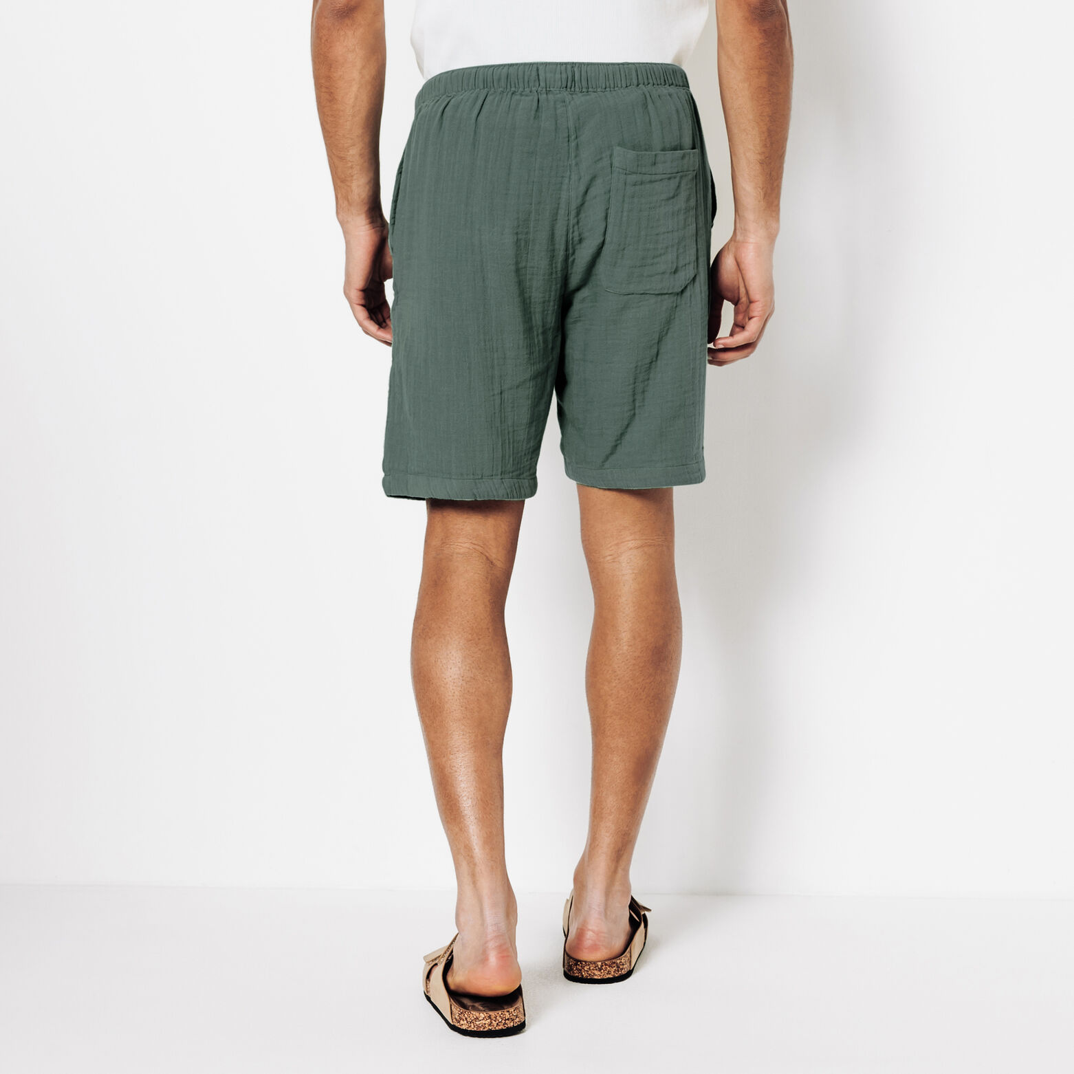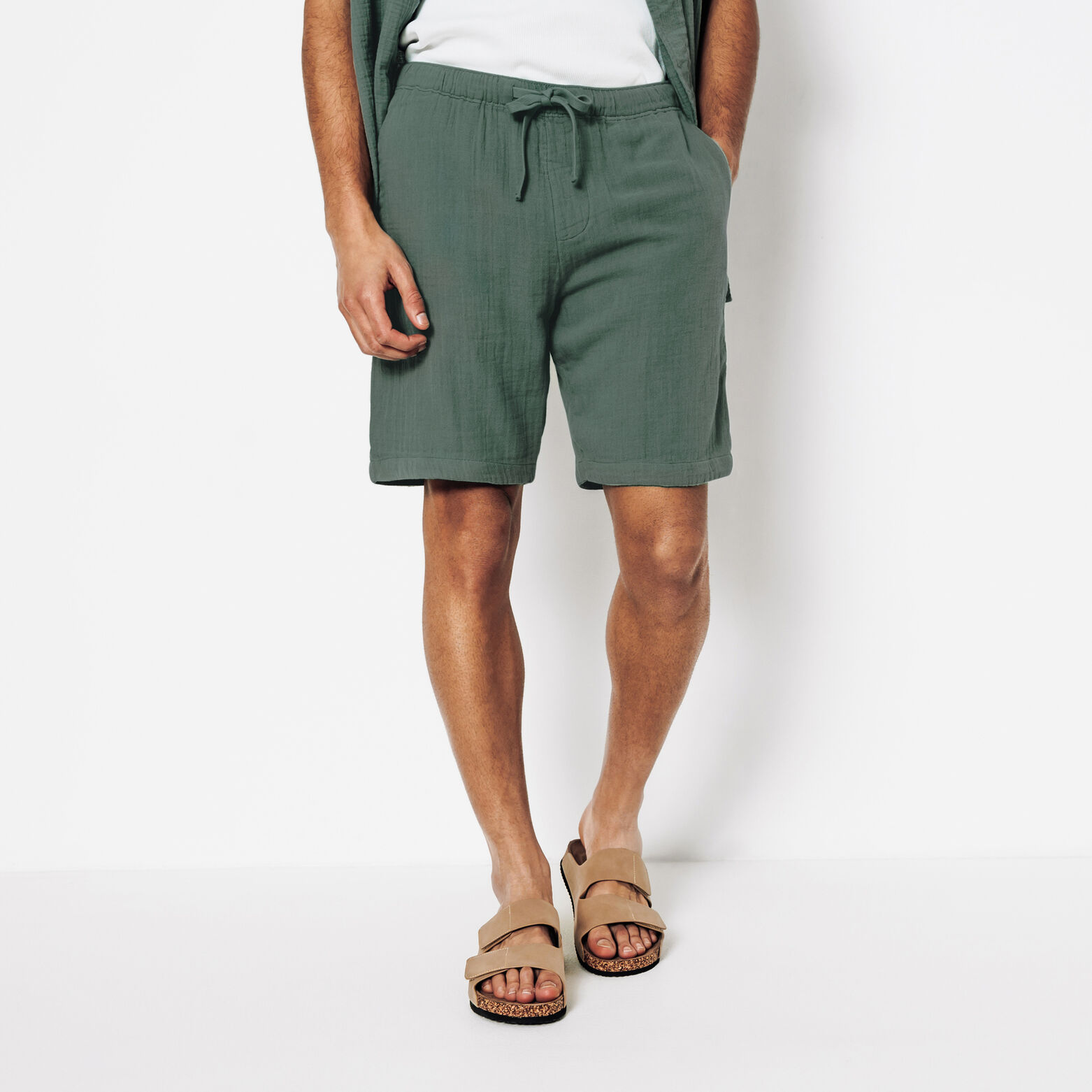 Ce bermuda en gaze de coton allie style et décontraction grâce à sa texture unique et sa taille élastique avec cordon de serrage.