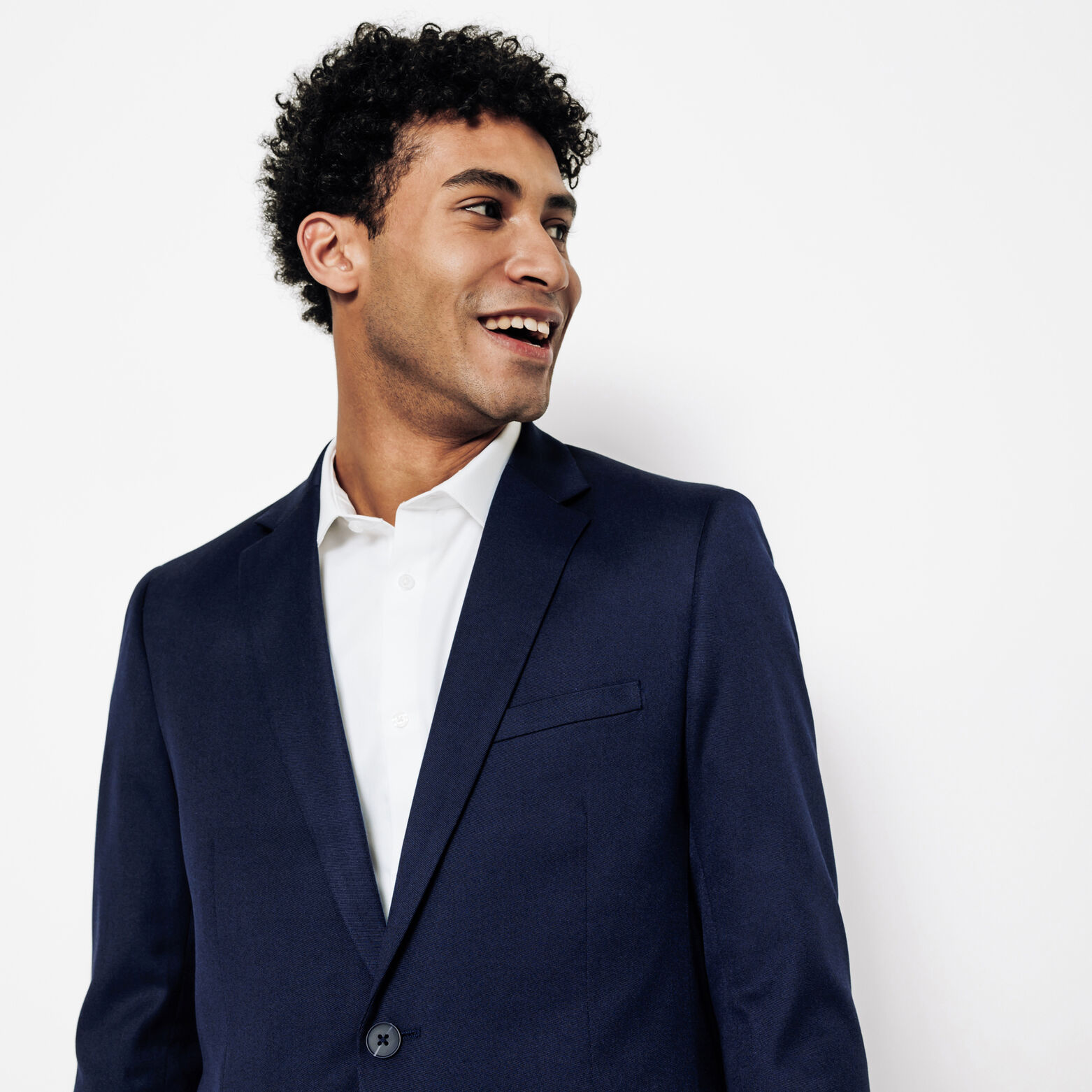 Cette veste de costume slim à deux boutons est un indispensable du vestiaire masculin. Avec ses deux poches latérales et sa poche poitrine, elle offre un look élégant et pratique.