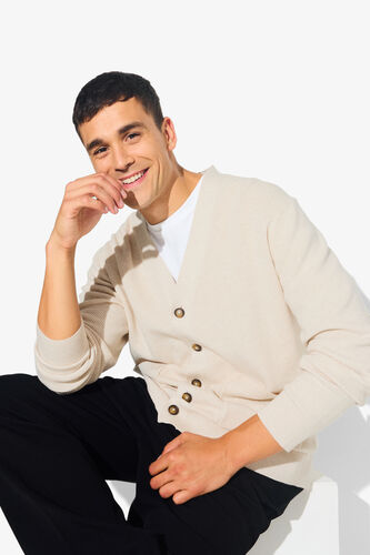 Ce cardigan peut être porté avec un t-shirt basique blanc et un jean brut pour un look décontracté. Pour une tenue plus habillée, il peut être associé à une chemise et un pantalon chino.