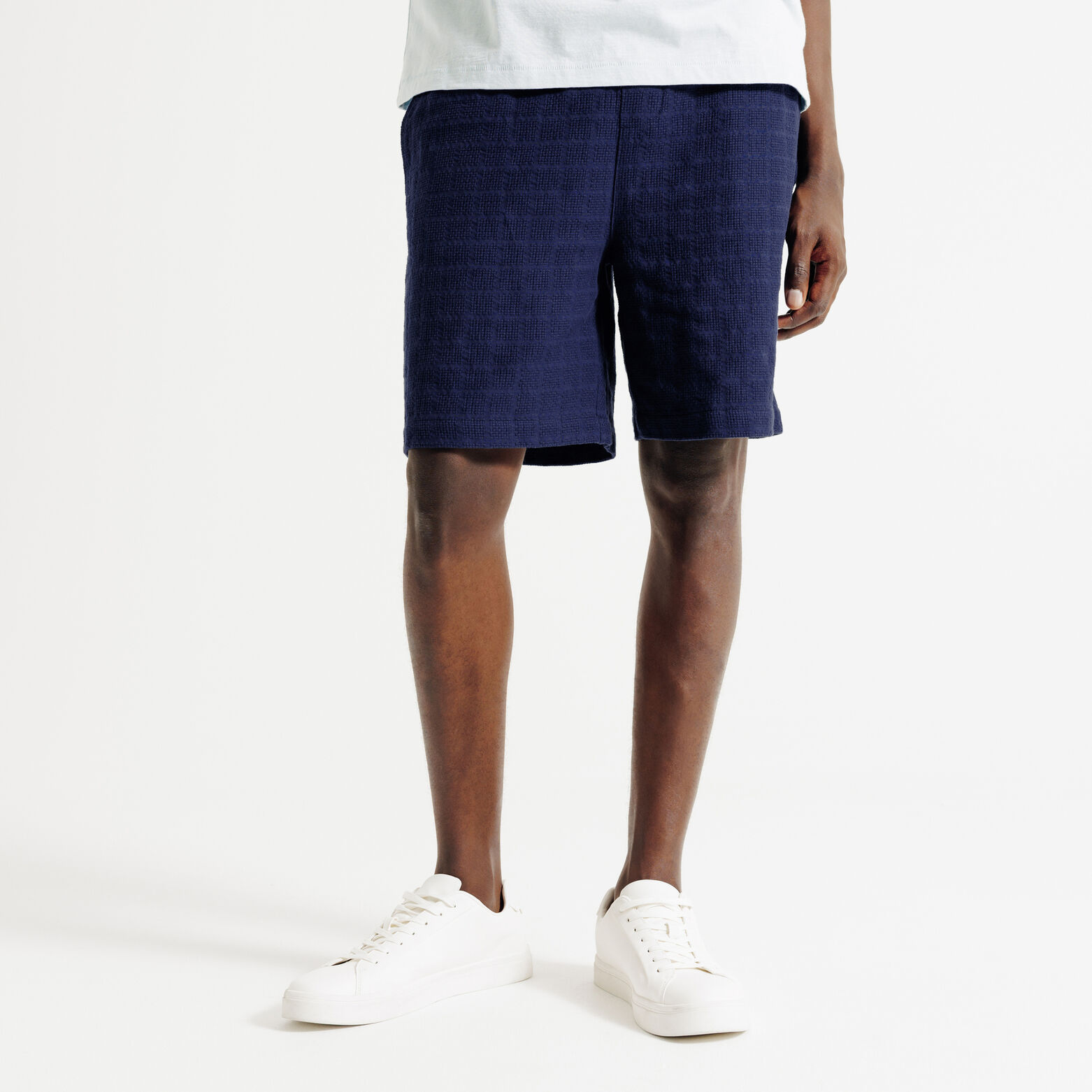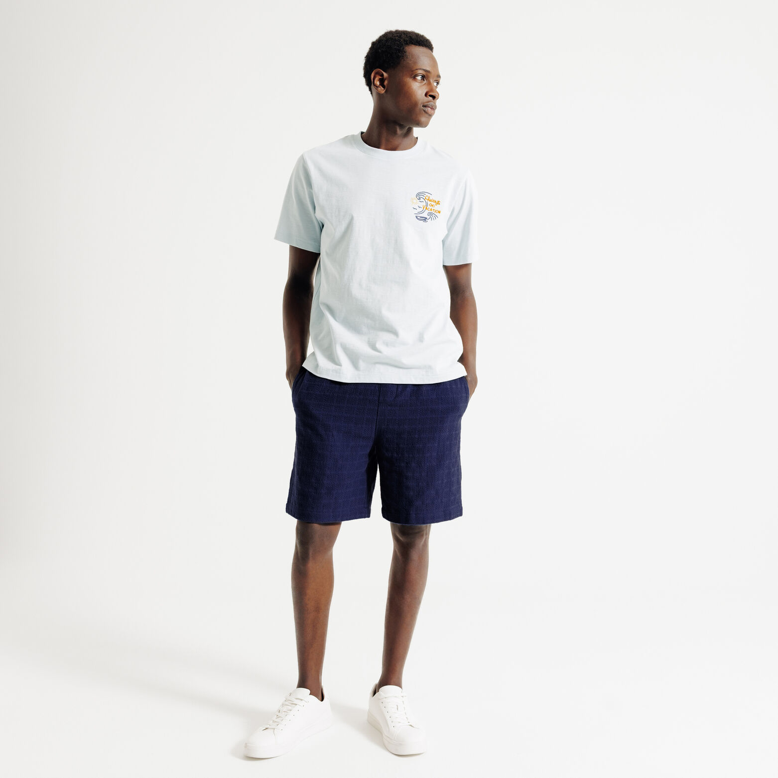 Ce short se marie parfaitement avec un t-shirt imprimé pour un look décontracté. On peut aussi l'associer à une chemise à manches courtes pour une allure plus soignée. Des baskets blanches complètent l'ensemble avec une touche moderne.