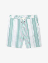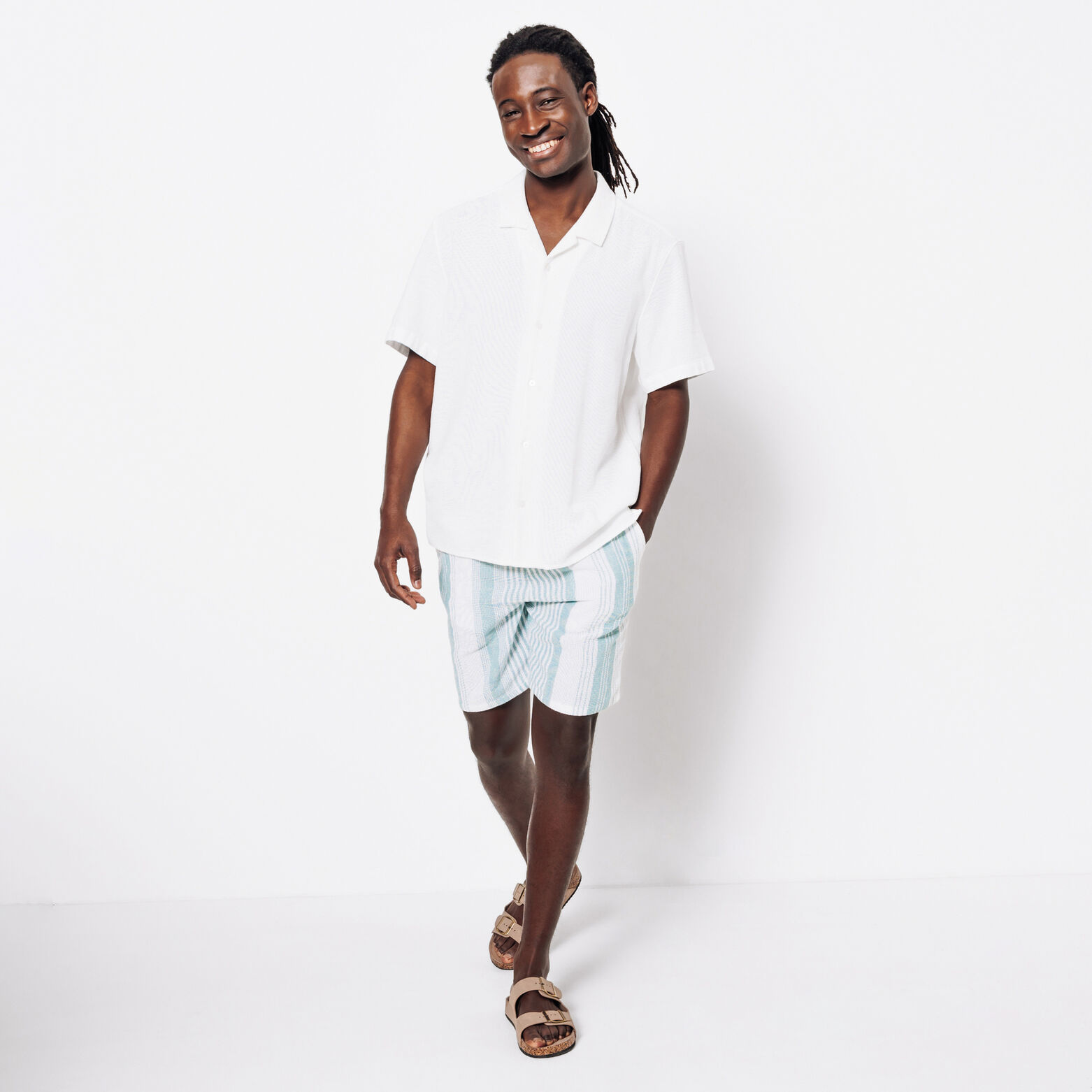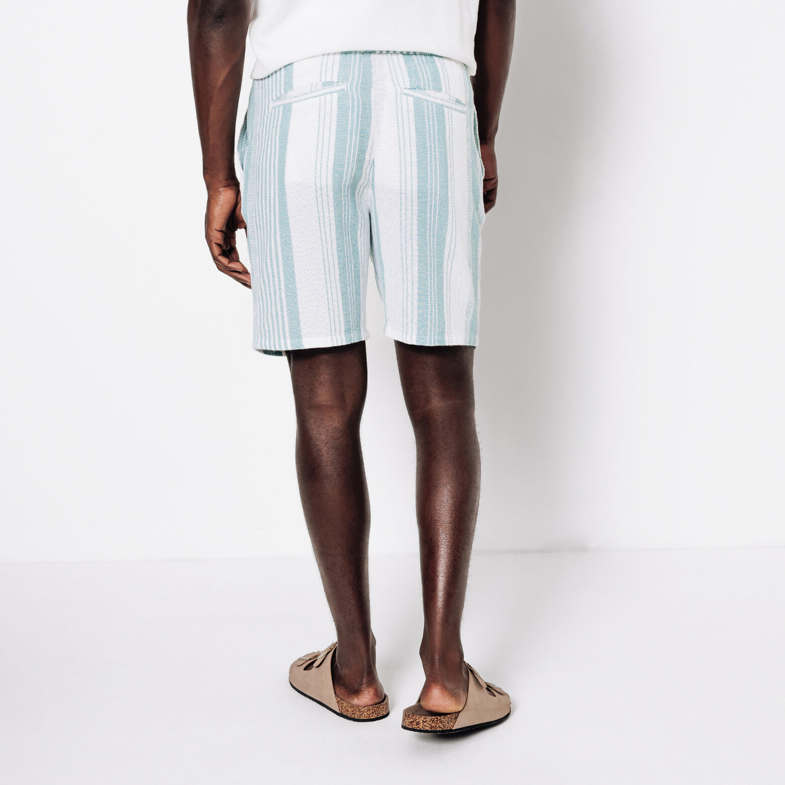 Deze gestreepte bermuda in reliëfstof met elastische taille combineert comfort en lichtheid, perfect voor deze zomer. Hij is makkelijk te combineren met een T-shirt of hemd.