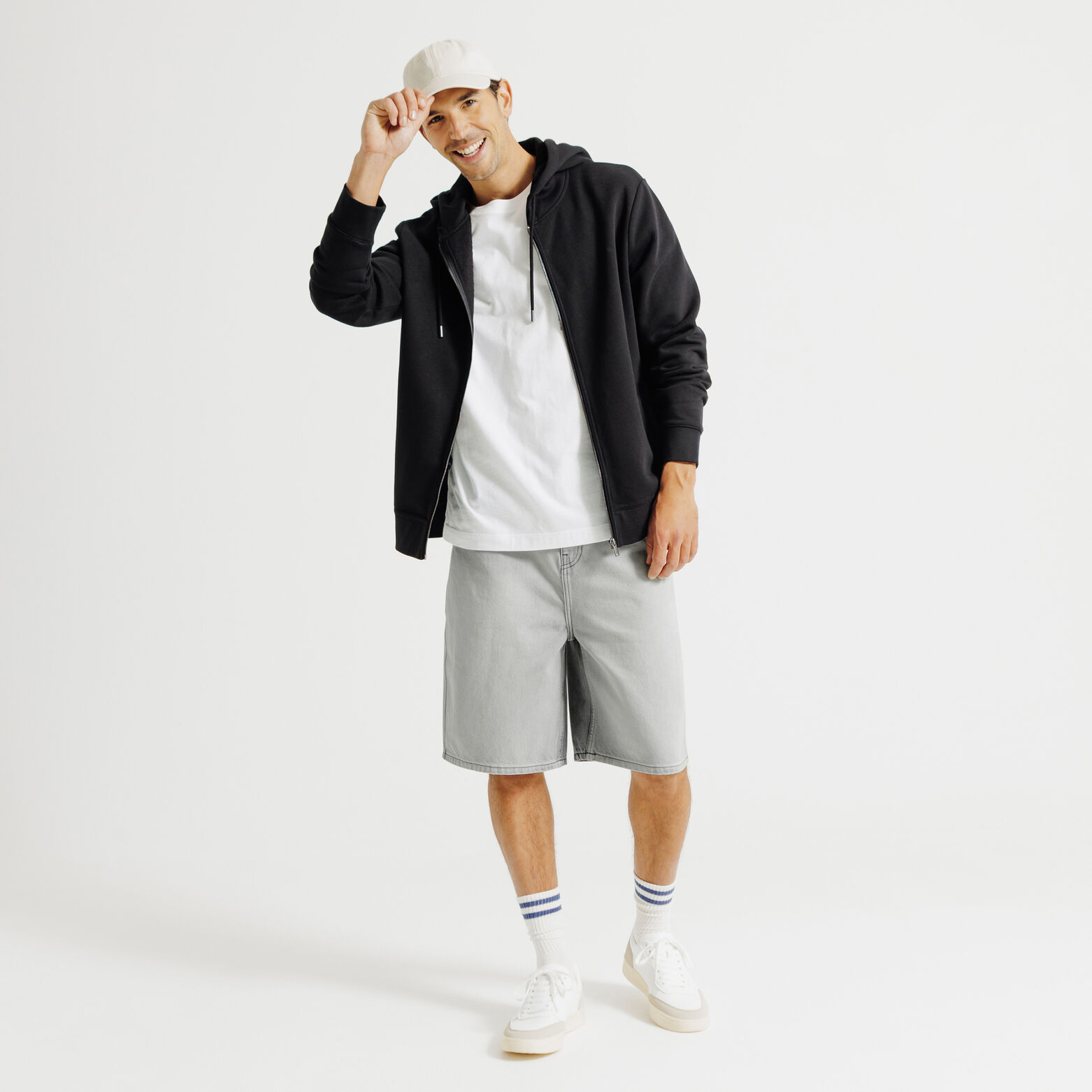 Deze denim short kan eenvoudig gedragen worden met een basic wit t-shirt, en witte sneakers voor een casual look. Voor een meer gewerkte stijl kan gekozen worden voor een t-shirt met zakje, en een hoedje. En voor een sportswear look, kan hij gedragen worden met een vest met kap en sneakers.